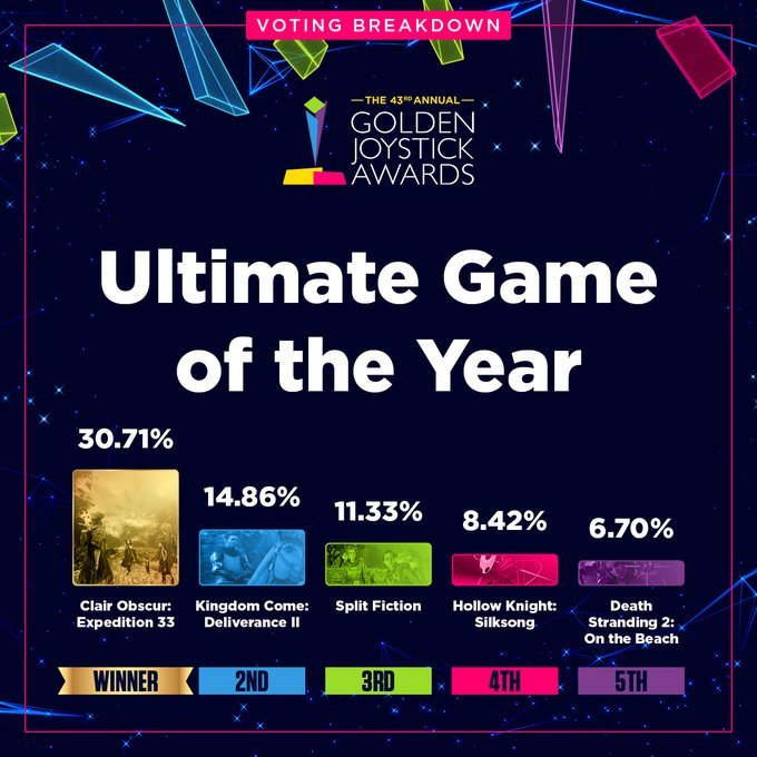 A organização revelou que foram 21 milhões de votos somados nas 22 categorias. E pela primeira vez divulgaram as porcentagens completas. Isso deixou ainda mais claro o tamanho da vantagem que Expedition 33 conseguiu.